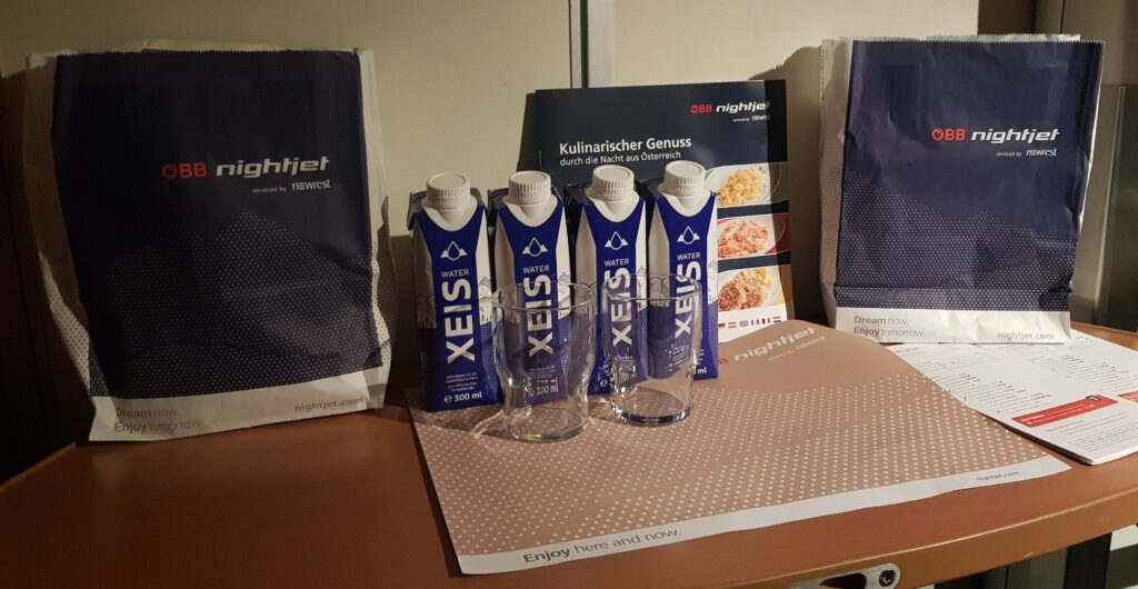 Martina und ich fahren nach Venedig. Wir treffen uns abends um 20:00 h, denn wir haben zwei Plätze im Schlafwagen gebucht. Um 20:22 h rollt der Zug ein und wir marschieren vorbei an den Abteilen die für Budapest bestimmt sind, an den Abteilen die für Wien und Zagreb bestimmt sind und alle in Salzburg abgekoppelt werden und dann sind wir da. Es herrscht eine fröhliche Stimmung, der Zug ist gut gebucht und kurz darauf sitzen wir in unserem Abteil. Der „Nightjet“ ist etwas anders ausgestattet als die Waggons die in Salzburg abgekoppelt werden, es gibt z.B. keinen Saft, dafür aber Hausschuhe und Schlafmasken und in der Toilette eine Dusche. Die Schaffnerin wandelt die Sitze in ein Bett um, wir trinken unseren alkoholfreien Sekt, putzen die Zähne und dann legen wir uns schlafen.