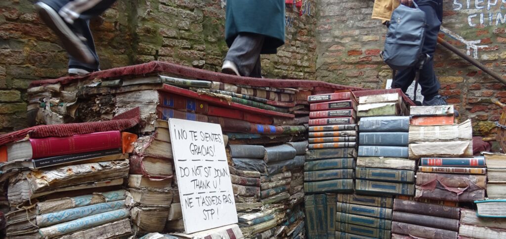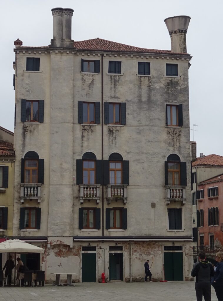 Wir werden vom Glockenklang einer Kirche geweckt, machen uns fertig für den Tag und frühstücken reichhaltig. So gerüstet ziehen wir los um all die Kirchen und Scuole anzuschauen die uns unser freundlicher Hotelier empfohlen hat. Leider biegt unser Vaporetto am Piazzale Roma in die falsche Richtung ab, so dass wir erneut an der Giudecca entlang fahren und am Markusplatz aussteigen. Das muss ein Trick der Tourismusindustrie Venedigs sein, dass man immer am Markusplatz landet. Nicht schlimm, laufen wir eben von dort los zuerst zum berühmtesten Buchladen in Venedig, der „Libreria Acqua Alta“. Dort ist es wirklich sehr ungewöhnlich mit Badewannen, einer Gondel und Booten die alle mit Büchern gefüllt sind, aber auch sehr touristisch. Wir ziehen weiter zur Scuola di San Marco. Die Scuole Venedigs waren ursprünglich Bet-, Bruderschafts- und Fürsorgehäuser von Handwerkszünften die finanziell gut gepolstert und so in der Lage waren die schönen Künste zu unterstützen. Die Scuola di San Marco liegt im oberen Stockwerk eines Krankenhauses und beherbergt alte Schriften und medizinisches Werkzeug. Während sich Martina alles anschaut warte ich draußen, lese ein bisschen und schaue umher. Dabei fallen mir auch die Schornsteine auf, die am oberen Ende wie Blüten auseinander gehen. Man hat sie damals so gebaut um die Stadt vor Funkenflug zu schützen, denn durch die Erweiterung wirbelte der Rauch länger herum und kühlte dabei ab. Was für eine tolle Idee. Unser nächster Halt ist die Kirche San Maria di Miracoli mit einer wunderschönen hölzernen bemalten Kassettendecke. Inzwischen meldet sich langsam ein kleines Hungergefühl, Zeit sich auf den Weg zum „Bacaro ae Bricoe“ am Fondamente dei Ormesini zu machen. Dort haben wir gestern unseren ersten Caffè getrunken und fanden es so charmant, dass wir beschlossen haben wieder hinzugehen. Und wir bereuen es nicht, es ist lustig, es ist lecker, der Caffè geht aufs Haus — wir sind verliebt. Nach unserem Spritz leicht beschwingt machen wir uns auf zum Vaporettoanleger um nach Murano zu fahren. Das Museum hat leider bereits geschlossen und in den Läden gibt es nichts was uns wirklich reizt. Wir schauen noch kurz in die Kirche Santa Maria e Donato, die aber außen mit dem runden Balkon interessanter ist als innen. Heute ist es recht frisch daher eilen wir zurück zum Vaporettoanleger um heim zu fahren. Auf dem Boot kurze Verwirrung, denn dort steht es fährt zur Giudecca, aber dann fährt es zum Glück doch zum Hotel. Wir erforschen die Restaurants in unserer Nachbarschaft und landen wieder im selben Restaurant wie gestern, wo wir wie alte Stammkunden begrüßt werden.