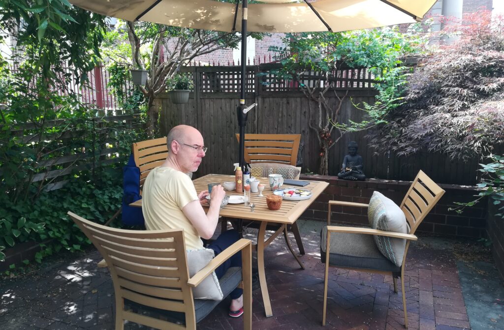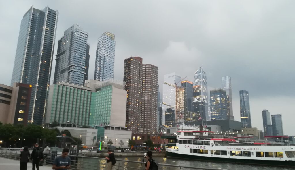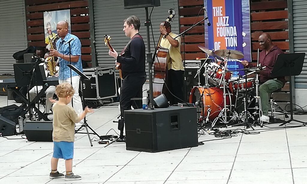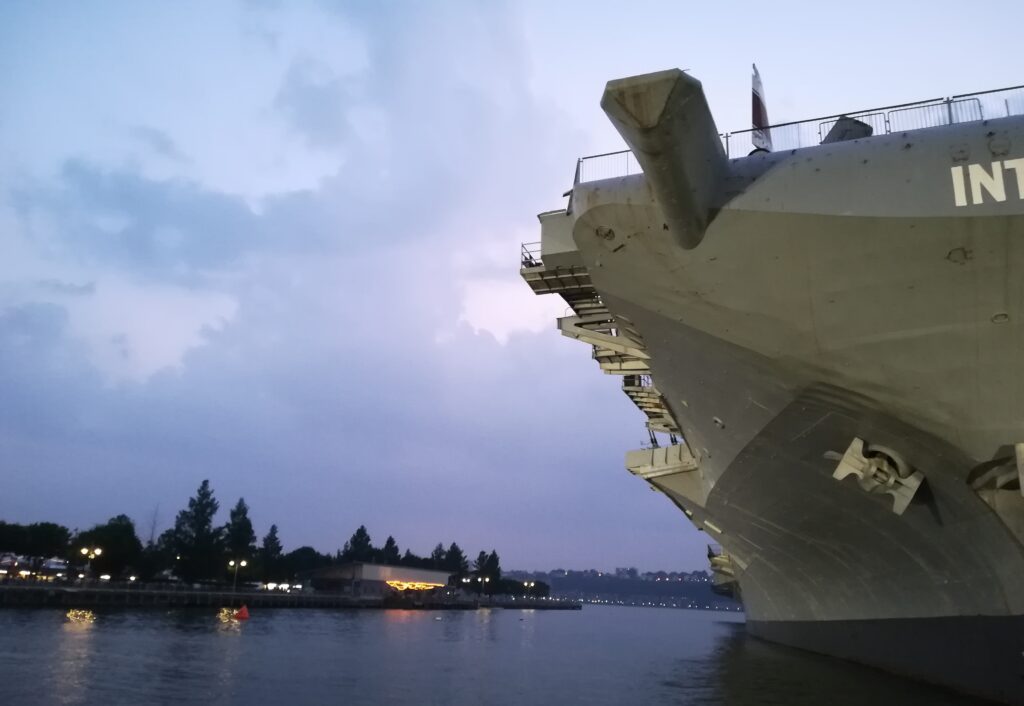 Wir haben beide leider schlecht geschlafen, mein Hals tut ziemlich weh, die Wäsche muss gewaschen werden, und es regnet — perfekte Konditionen für einen Homeday. Boris ist fast wieder gesund und zieht los um sich zwei Plattenläden anzuschauen und ich lese und schlafe ein bisschen. Gegen Abend geht es mir etwas besser und wir fahren zum Pier 84 am Hudson River um uns das Eric Person Quintett anzuhören. Es ist leichter Jazz und die Stimmung am Fluss ist einfach toll. Neben dem Pier liegt der Flugzeugträger „Intrepid“, der in ein Museum umgewandelt wurde.
