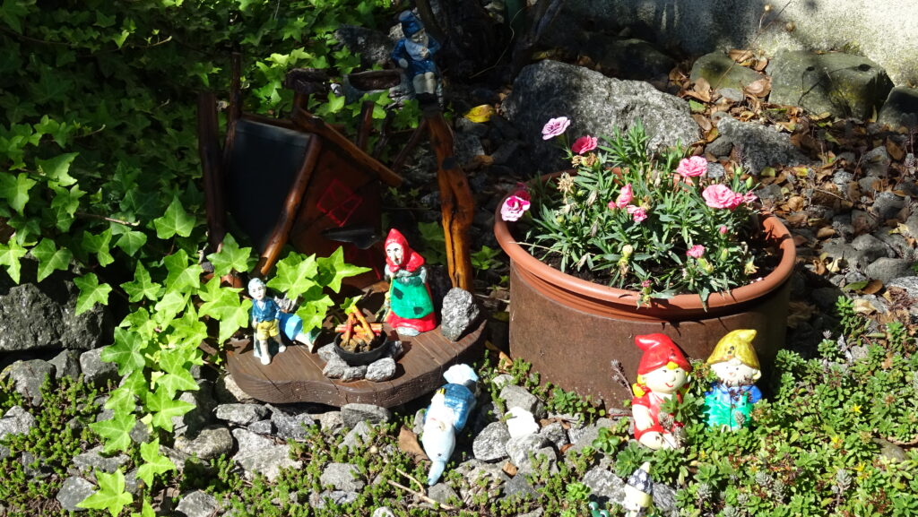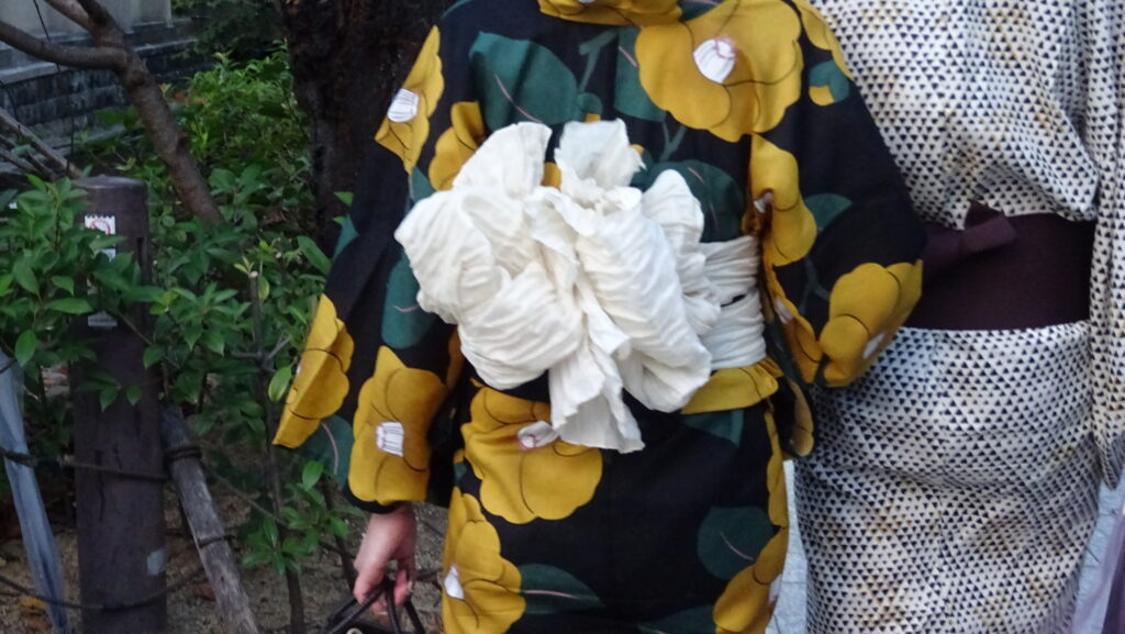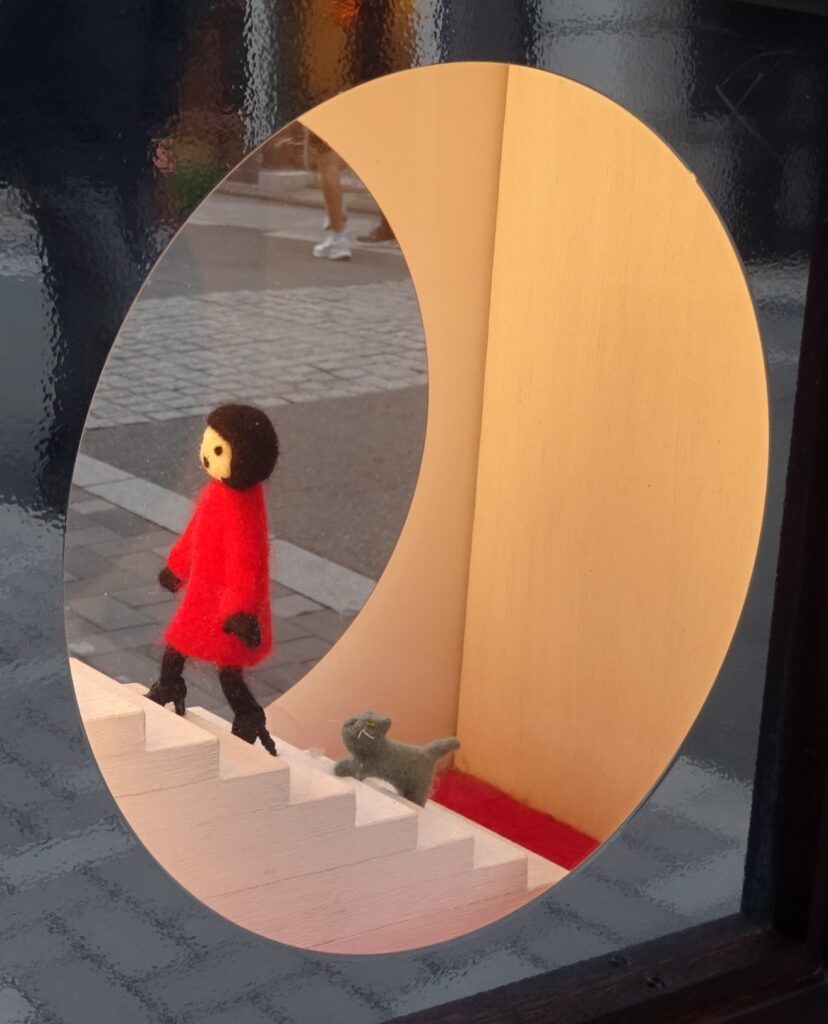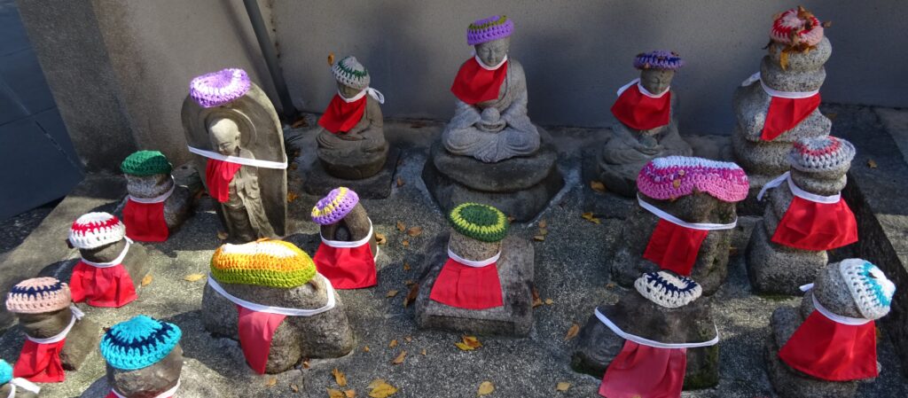 Heute steht kein Shopping auf dem Programm, wir wollen uns den Rokkaku-do Tempel anschauen, der Ort an dem Mönche die Blumensteckkunst Ikebana entwickelt haben sollen. Ich habe nachgelesen wie man sich in einem Tempel verhält und wir finden zwar die Waschstelle erst hinterher, aber die Anzahl der Verbeugungen passt, wir werfen zweimal fünf Yen ein, entzünden jeder eine Kerze und ich schlage ganz leise den Gong. Im Garten bewundern wir die zahlreichen Steinfiguren mit gehäkelten Mützen und im Teich einen riesigen Koi und zwei Schwäne, es ist sehr schön an diesem friedlichem Ort. Als nächstes steht die Burg Nijo auf unserem Plan, aber die Warteschlange ist sehr lang und wir beschließen, dass uns die Außenansicht reicht und gehen weiter Richtung Bahnhof um unsere Tickets für den Shinkansen, den zug nach Hakone, zu kaufen. Und dann ist es auch schon Kaffeezeit. Das erste Café hat geschlossen, das zweite eine lange Warteschlange und bevor wir zum dritten kommen stehen wir vor dem „Vintage Coffee“, einem Vintageladen mit winzigem Café. Die Besitzerin holt einen Klappstuhl, alle rücken ein wenig zusammen und wir werden köstlich versorgt, was für eine schöne Entdeckung. Gestärkt gehen wir weiter Richtung Fluss und schlendern am Ufer entlang zur Haupteinkaufsstraße wo sich nun unsere Wege trennen. Boris hat noch ein paar Plattenläden auf seiner Liste und ich will noch einmal versuchen das Geschäft „Loft“ zu finden. Weil der Weg entlang eines kleinen Kanals mir viel attraktiver erscheint als die große Straße, bummele ich dort entlang und vergesse zu zählen wann ich abbiegen muss und da Boris meine SIM-Karte hat, bin ich auf mein Gedächtnis angewiesen. Also wieder zum Ausgangspunkt zurück und eben doch entlang der großen Straße, nach der dritten Querstraße müsste es links kommen. Success, im sechsten Stock bin ich im Papierparadies. Zweieinhalb Stunden später stelle ich erschrocken fest, dass es bereits 19 Uhr ist. Ich mache mich schnell auf den Weg, muss dann aber doch noch in einem winzigen Buchladen eine der japanischen Kokeshi-Puppen kaufen, die mag ich einfach zu gerne. Um halb acht Uhr bin ich daheim und wir gehen zusammen zum Supermarkt um unser Abendessen, Salat und Reispäckchen, zu kaufen.