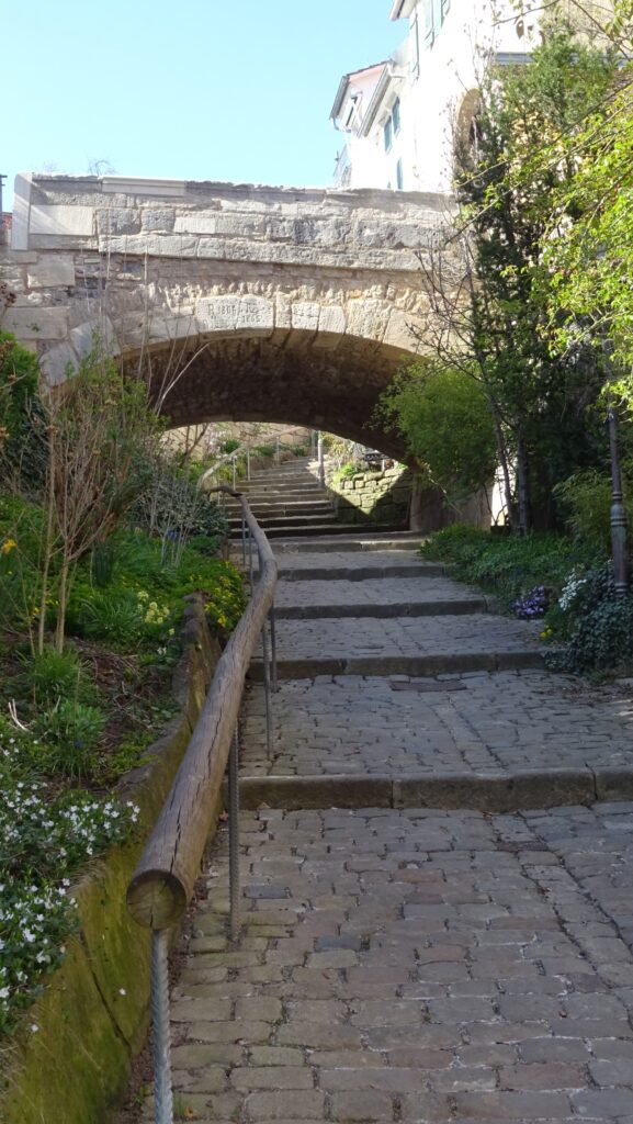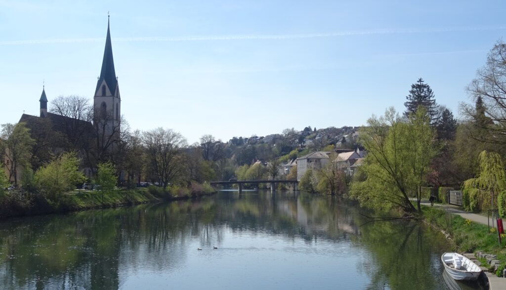 Heute ist Donnerstag, also eigentlich nicht der planmäßige Tag für einen Überraschungstrip. Um 10:15 h stehe ich an Gleis 1 und sehe, dass der erste Zug nach 10:20 h nach Tübingen fährt (da war ich gerade erst) und der zweite nach Gaildorf (da habe ich nicht so richtig Lust drauf). Und da ich sowieso schon schummele, setze ich noch eins drauf und nehme den Zug um 10:18 h. Dieser Zug kommt in einer Stunde in Horb an, aber das kenne ich ja auch bereits. Deshalb beschließe ich heute länger zu fahren. Irgendwann soll der Zug geteilt werden, der hintere Teil fährt nach Rottenburg und der vordere nach Freudenstadt. Letzteres klingt fröhlicher, deshalb steige ich in Böblingen nach vorne um. In Bondorf kommt dann die traurige Nachricht, ein „Personenschaden“ auf unserer Strecke. Um mich herum wird viel telefoniert, ich lese. 30 Minuten später kommt die Durchsage, dass in 45 Minuten ein Busersatzverkehr eingesetzt wird. Ich steige aus um Bondorf zu erforschen, muss allerdings feststellen, dass dies schnell erledigt ist. Ich überlege ob ich zurück zum Bahnhof soll, da sehe ich eine Bushaltestelle für einen Bus nach Rottenburg und kurz darauf steige ich ein. Die Fahrt führt vorbei an der Wurmlinger Kapelle, einem alten Wachturm und vielen, vielen blühenden Obstbäumen. In Rottenburg steige ich beim Marktplatz aus, hole mir in Büro der Touristeninformationen einen Stadtplan und schlendere los. Die Stadt ist wirklich wunderhübsch und sehr entspannt. Ich fotografiere die schönste gotische Brunnensäule Südwestdeutschlands, trinke einen Cappuccino und esse ein Franzbrötchen und dann gehe ich in die 2017 eröffnete Bibliothek, da vergeht die Zeit natürlich schnell. Weiter geht es zum Stadtgraben in dem sich heute ein großer Spielplatz befindet und dann stehe ich auf der Brücke über den Neckar und denke wie so oft, dass ein Fluss, der Teil der Stadtlandschaft ist, einfach sofort Urlaubsgefühle weckt. Am Fluss entlang und dann links sollte der Pulverform kommen, aber ich werde durch ein Straßenschild auf dem „Klein Venedig“ steht abgelenkt, das muss ich mir natürlich anschauen. Es ist ein sehr nettes verwinkelten Viertel, allerdings ohne Kanäle. Nach dem Pulverturm gehe ich über eine andere Brücke zurück und stapfte die Stufen hinauf zum letzten Punkt auf meiner Agenda, dem Kalkweiler Tor. Danach geht es wieder zum Bahnhof und nach einer Viertelstunde warten kommt auch schon mein Zug. Das läuft ja wunderbar denke ich, als kurz nach Tübingen die Durchsage kommt der Zug sei kaputt. Wir fahren zurück und alle wetzen zum nächsten Zug, der dann natürlich total überfüllt ist. Um 18:38 h kommen wir in Stuttgart an.