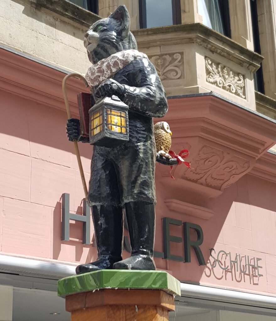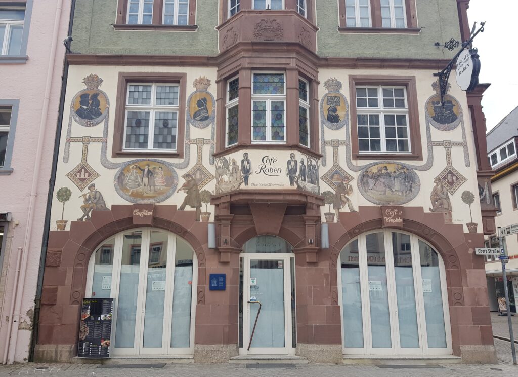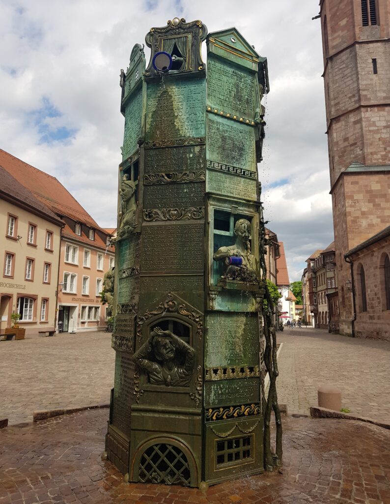 Mit den Überraschungstrips will ich den Sommer über pausieren und stattdessen den Neckar von der Quelle bis nach Stuttgart erforschen. Boris wollte eigentlich mal auf einen der Überraschungstrips mitkommen, ist dann aber ganz begeistert, als er hört, dass es nach Schwenningen geht, denn dort soll es ein Phonomuseum geben. Es stellt sich allerdings heraus, dass das Museum in St. Georgen ist, dem Ort aus dem unzählige Dual Produkte stammen. Da die generelle Richtung stimmt, fahren wir deshalb zuerst dorthin. Auf dem Weg haben wir in Villingen eine halbe Stunde Zeit zum Umsteigen und anstatt auf dem Bahnhof zu warten, machen wir einen kurzen Abstecher in das hübsche Städtchen. In St. Georgen geht es dann steil bergauf zum Museum. Wir sind beide sehr beeindruckt von der Vielzahl der Produkte die hier gezeigt werden. Ein bisschen mehr Information hätten wir uns zwar gewünscht, aber eine Demonstration von zwei Grammophonen und einem Orchestrion entschädigt uns schnell. Die Zeit vergeht wie im Flug und bald ist klar, dass wir den direkten Zug nach Schwenningen nicht erreichen werden. Das bedeutet, mit dem Zug zurück nach Villingen und von dort mit dem Bus weiter. Weil unser Zug leider Verspätung hat und wir deshalb den Bus (der nur jede halbe Stunde fährt) verpassen, beschließen wir uns Villingen etwas besser anzuschauen. Wir bummeln die Obere Straße entlang auf der Skulpturen der verschiedenen Villinger Fasnetfiguren stehen. Der Narro ist hier im Ort die Hauptfigur, aber der Kater Miau gefällt uns natürlich am besten. Während Boris sich im örtlichen Plattenladen umschaut, kaufe ich zur Erinnerung ein kleines Deko-Reh und schaue mir von außen das Münster und den 1989 von Klaus Ringwald entworfenen Brunnen auf dem Münsterplatz an. Anschließend gehen wir in das wunderbare „Kaffeehaus Villa“ und essen zu leckerem Kaffee riesige Stücke Karottenkuchen. Langsam wird es spät und wir machen uns auf den Weg Richtung Bahnhof. Dabei kommen wir am „Café und Weinstube Raben“ vorbei, das sich in einem historischen Gebäude aus dem Jahr 1631 befindet und 1911 von dem Maler Albert Säger wunderschön dekoriert wurde. Leider ist es zur Zeit geschlossen. Kurz darauf stehen wir auf dem Bahnsteig und sind bereit für den Heimweg. Schwenningen muss leider warten.