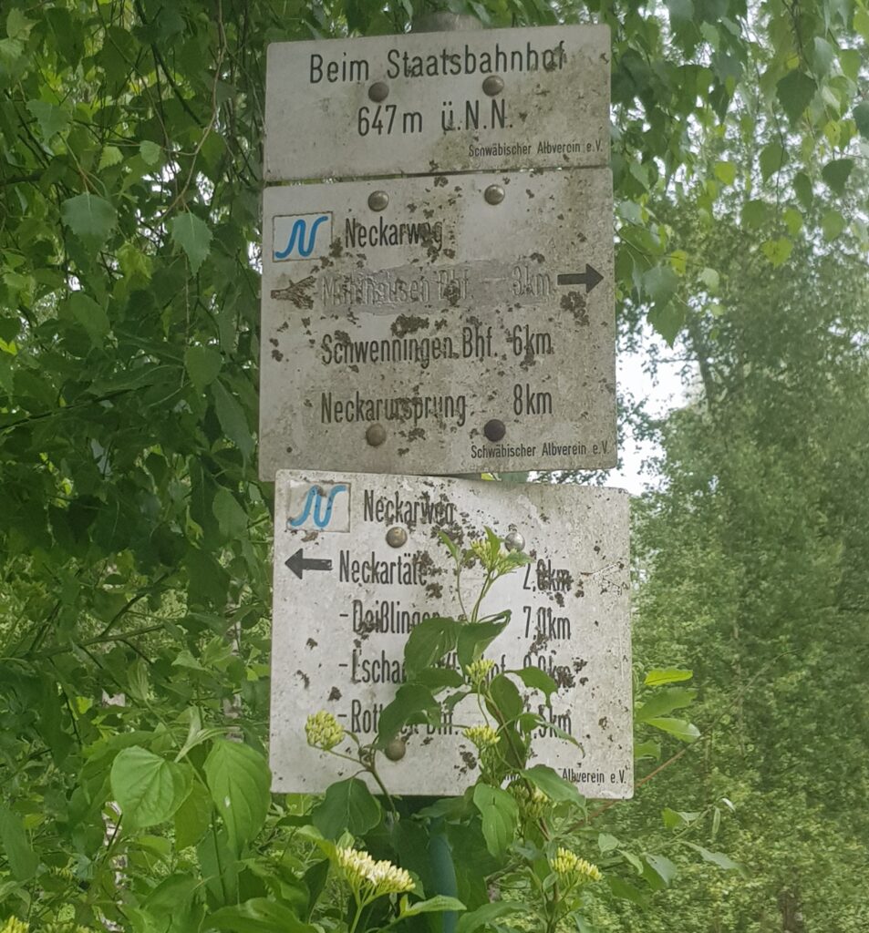 Heute will ich zur Neckarquelle und dann ein Stück den Fluss entlang. Mal schauen wie weit ich kommen werde. Aber zuerst frühstücke ich gemütlich und nehme den etwas späteren Zug um 10:27 h. Einmal umsteigen in Rottweil und pünktlich um 12:06 h bin ich in Schwenningen. Die Neckarquelle ist ausgeschildert und zwanzig Minuten später bin ich schon da. 1581 errichtete Herzog Ludwig von Württemberg hier einen Stein mit der Inschrift, „Da ist des Neccars Ursprung“ und 1822 trank der württembergische König Wilhelm I aus dieser Quelle. 1895 versiegte sie, wurde aber 1907 neu gefasst. 1934 gab es den Versuch das Schwenninger Moos als Neckarursprungsort festzulegen, dies wurde aber 1981 korrigiert. Und hier noch kurz ein paar Daten: Der Neckar ist 367 km lang, hat 27 Schleusen und ist mit einer Durchschnittstemperatur von 16 Grad Deutschlands wärmster Fluss. 2010 wurde im Rahmen der Landesgartenschau um die Quelle herum ein Park angelegt durch den ich nun am Wasser entlang losziehe. Bald komme ich zum Ortsrand von Schwenningen und wandere vorbei am Casino und einem Küchenstudio weiter. Bedauerlicherweise ist der Neckarweg gleichzeitig der Neckarradweg. Das bedeutet, er ist flach, asphaltiert und relativ langweilig. Einmal höre ich einen kleinen Wasserfall, linkerhand liegt in weiter Ferne ein Flugplatz mit Museum, ich komme an einem Hundefutterhersteller vorbei und werde von einem der Mitarbeiter nach der Zeit gefragt, weil er seine Uhr verloren hat, am Wegrand blühen wilde Iris, Habichtkraut und Natternkopf, ein Wanderer sieht mich mit dem Handy hantieren und ruft mir zu, dass laut einem neuen Gesetz das Wandern mit Handy jetzt verboten sei, in einem Waldstück zwitschern trotz der Hitze die Vögel. Es ist also schon kurzweilig, aber mir fehlt das Auf und Ab und nach zwei Stunden spüre ich deutlich meine Hüfte. Laut Google müsste in Kürze der Staatsbahnhof von Trossingen kommen, vielleicht gibt es dort ein Café und ich kann mich ein bisschen stärken. Aber leider ist der Bahnhof nur ein Bahnsteig und der Ort selbst ist 4,2 km entfernt. Der Zug nach Rottweil ist vor drei Minuten abgefahren und der nächste kommt erst in 50 Minuten, also heißt es warten. Auch in Rottweil ist der Bahnhof außerhalb des Ortes gelegen und so stapfe ich den Berg hinauf Richtung Café Herz, trinke dort einen recht schlechten Kaffee und esse ein Stück eher mittelmäßigen Kuchen. Zurück am Bahnhof sehe ich, dass der schnelle Zug 20 Minuten Verspätung hat und der langsame nur 5 Minuten verspätet losfährt. Leider schaffe ich es aber nicht mehr auf den langsamen Zug und muss daher wieder warten. In Böblingen plane ich in die S-Bahn umzusteigen, aber es gibt Gleisstörungen und so verzögert sich auch hier die Abfahrt. Am Feuersee fährt mir der Bus Nr. 41 vor der Nase weg und ich fahre mit dem Bus Nr. 43 bis zum Marienplatz, weil es dort ein Wartebänkchen gibt. Als ich an der Haltestelle sehe, dass der nächste Bus Nr. 41 ausfällt, beschließe ich mir ein Eis zu gönnen. In der Eisdiele drängelt sich eine junge Frau von der Seite her vor, aber ich habe keine Lust mich zu ärgern und das Eis ist lecker und versöhnt mich mit diesem etwas unbefriedigenden Tag. Da der Rest des Neckarwegs sicher auch asphaltiert sein wird, bin ich inzwischen am Überlegen, ob ich im Sommer nicht andere Ausflüge machen soll.