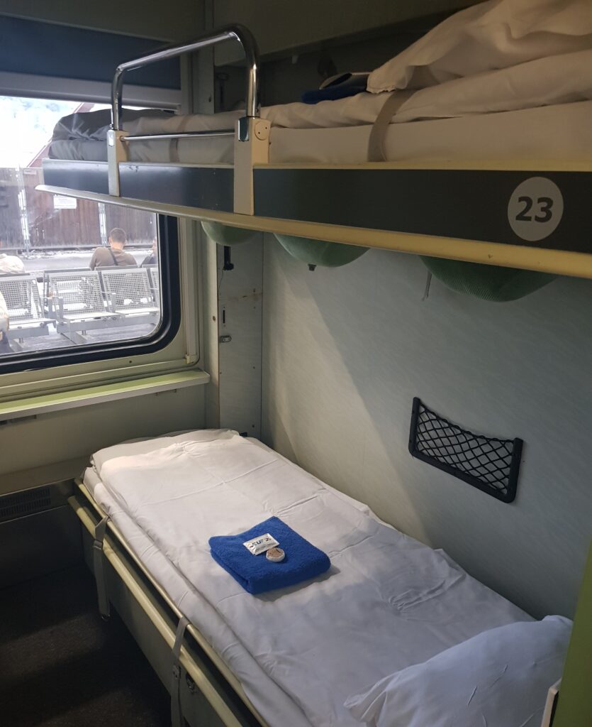 Um 19:45 h ziehen wir los und kurz darauf am Bahnhof in unser kleines Zuhause für unterwegs ein. Wir kennen ja schon alles von unserer 2024 Balkanreise und freuen uns riesig. Zum Einstimmen holen wir uns noch zwei Dosen ungarisches Bier und dann geht es los. In München bekommen wir leider zwei sehr aufgeregt Kabinennachbarinnen, aber nachdem Boris sie gebeten hat ruhiger zu sein, wird es still und wir können wieder schlafen. Ich wache rechtzeitig auf, wir ziehen uns an und dann kommt unser Frühstück, zwei Scheiben Weißbrot, Kaffee, Saft, Käse und diverse Aufstriche. Jetzt kann unser Wienabenteuer beginnen.