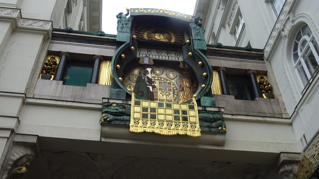 Leider ist das Wetter immer noch sehr unfreundliche, deshalb frühstücken wir gemütlich und ziehen recht spät los. In meinem alten Reiseführer gibt es eine Walkingtour und die wollen wir heute mal ablaufen. Am Stephansdom geht es los und da schauen wir natürlich kurz bei „Carla“, einem karitativen Gebrauchtwarenladen rein und ich kaufe einen kleinen Puppenkopf. Weiter geht es zu verschiedenen Sehenswürdigkeiten, wovon wir eine riesige Jugendstiluhr am beeindruckendsten finden. Es ist die Ankeruhr, die 1911 anlässlich der Gründung der Anker Versicherungsgesellschaft von Franz von Matsch als Brücke zwischen zwei Häusern erbaut wurde. Sie zeigt im Lauf von zwölf Stunden zwölf für Wien historisch bedeutende Figuren an. Was wir auch sehr schön finden ist ein Jugendstilgebäude, in dessen Erdgeschosssich sich ein „H&M“ befindet. Inzwischen ist es Zeit Kaffee zu trinken und danach wollen wir ins Spittelbergviertel, denn dort gibt es einige Plattenläden. Aber nicht nur, sondern auch sehr nette Cafés und einen Kiloladen in dem ich ein cooles Hemd finde das mir Boris schenkt. Weil das alles doch recht anstrengend war, kaufen wir fertige Tomatensoße, Pasta ist noch da und entspannen daheim.