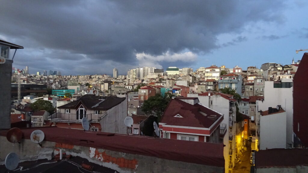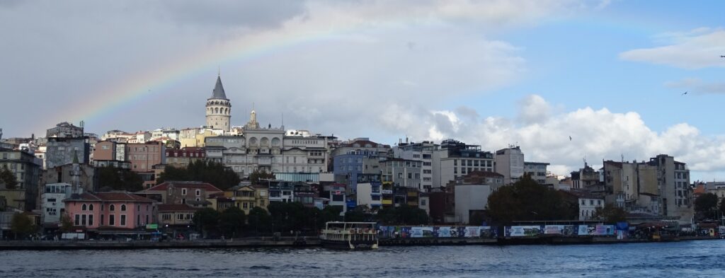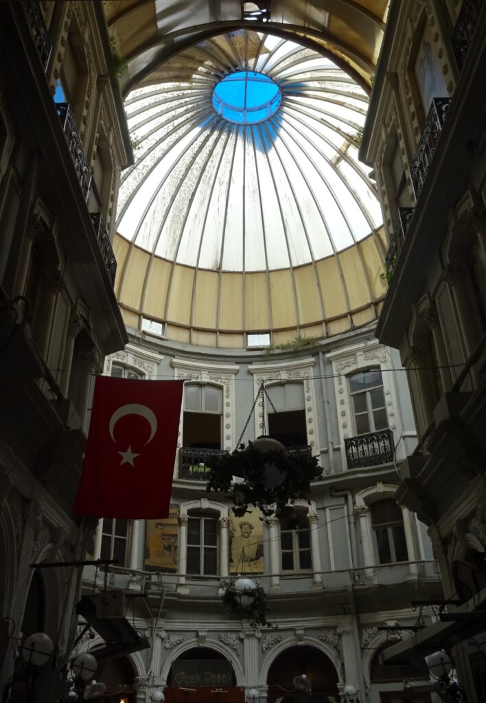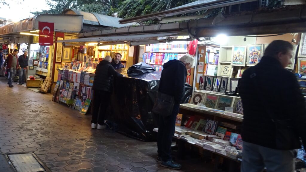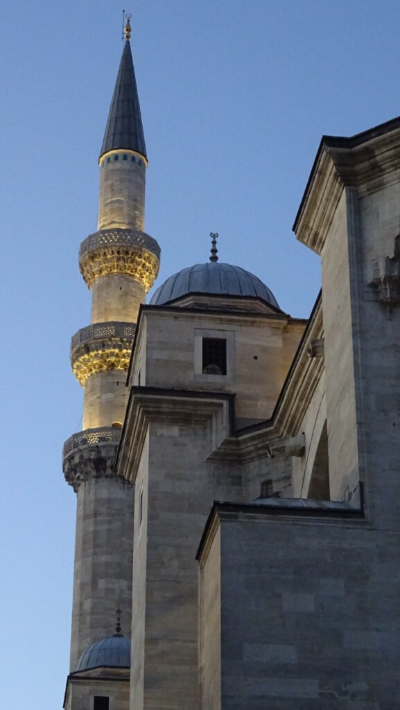 Als erstes wollen wir uns heute einen Stadtplan zu holen und ein Sammelticket für die Blaue Moschee, die Hagia Sophia und die versunkenen Zisternen. Die Tourist Information liegt gut versteckt im dritten Stock eines alten Gebäudes in einer Touristenmeile und dort erfahren wir, dass die Blaue Moschee keinen Eintritt kostet und man mit dem Ticket nur in einen Teil der Hagia Sophia rein kommt. Dafür haben wir jetzt jeder einen, zwar etwas rudimentären Stadtplan, der aber immerhin einen Metroplan hat. Anschließend fahren wir mit einer riesigen Fähre wieder nach Eminönü, bestaunen den alten Bahnhof, der ursprünglich eine der Endstationen des Orient Express gewesen ist und gehen dann durch den Park Richtung Topkapi Palast. Hier schauen wir uns alles an, was frei zugänglich ist und machen uns dann auf die Suche nach einem Café. Dabei landen wir im Fashion District von Istanbul und finden fast nicht mehr hinaus. Mit Hilfe von Google Maps und ein paar Läden, an die wir uns erinnern, finden wir schließlich den Weg zum „Café Sabor“ und essen nochmal jeder ein Stück von dem leckeren home made Käsekuchen. Der letzte Punkt auf der heutigen Agenda ist der Bücher Basar. Er ist überschaubar und als wir ihn am anderen Ende verlassen, stehen wir — oh nein — wieder im Fashion District. Zum Glück wissen wir jetzt den Weg hinaus. Wir folgen den Schildern zur Metro Station vorbei an den vielen wunderbaren, beleuchteten Moscheen und sind so ganz schnell wieder in Beyoglu, unserem Viertel.